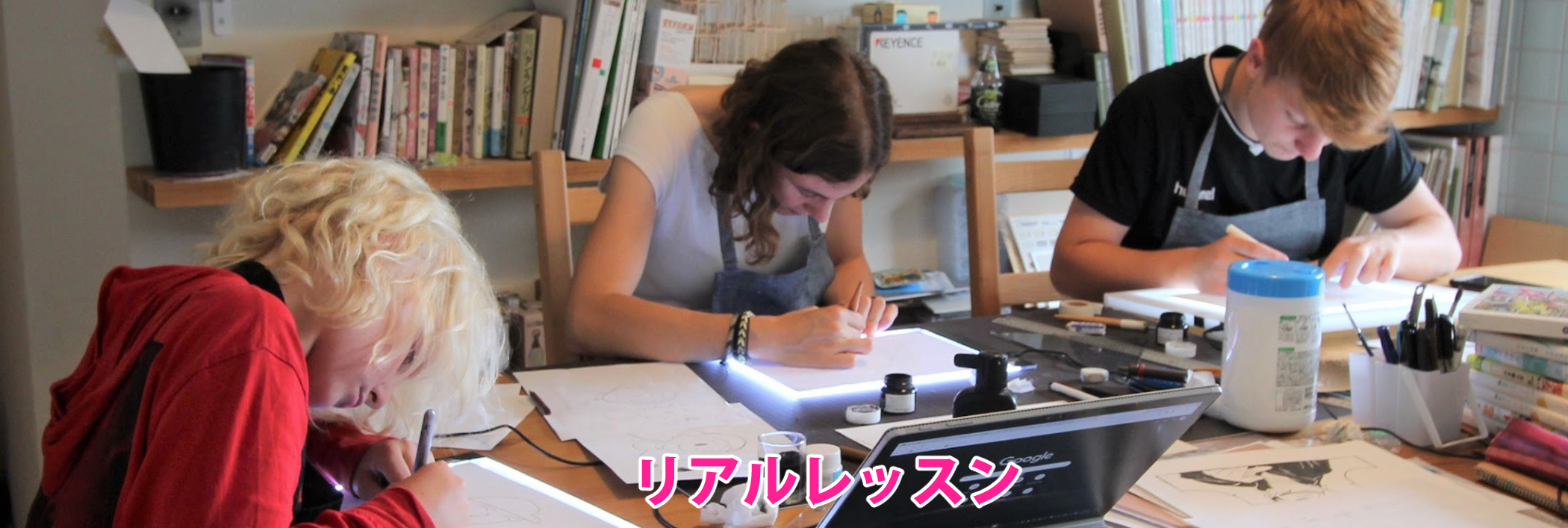 本物のマンガ家と会って一緒に絵を描くなんてクールな体験です!ユウさんは他に二人のマンガ家を連れてきてくれたので、才能のあるアーティストに囲まれたような感じがしました。私達は一つのキャラクターを通して、鉛筆の下描きからペン画の仕上げまで行いました。私は日本語を勉強中なので、できる限り日本語を話そうとして、皆さんはそれを忍耐強く聞いてくれました。皆さんは英語も話し、私の質問にも答えてくれて助かりました! ユウさん、ありがとうございました!